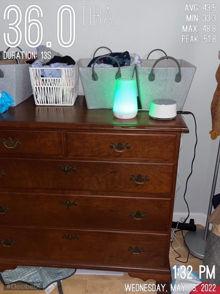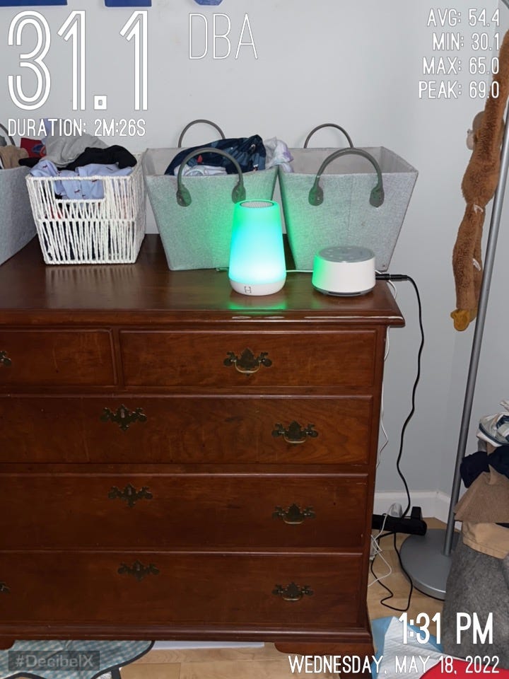 I measured the sound level of the Rest with the Decibel X:dB Sound Level Meter app from SkyPaw Co. Ltd. With an ambient noise level in my son’s room of 33.2 dB (while measuring mid-day in a moderately busy area in San Francisco), I got that having the Rest on 20 percent sound gave off 31.1 dB (so you can consider that as “no noticeable difference.” I couldn’t hear the Rest over the ambient noise of my husband working and cars passing below 15 percent, which, yep, my son can actually nap through. If his body actually wants to nap… That’s a whole other challenge.