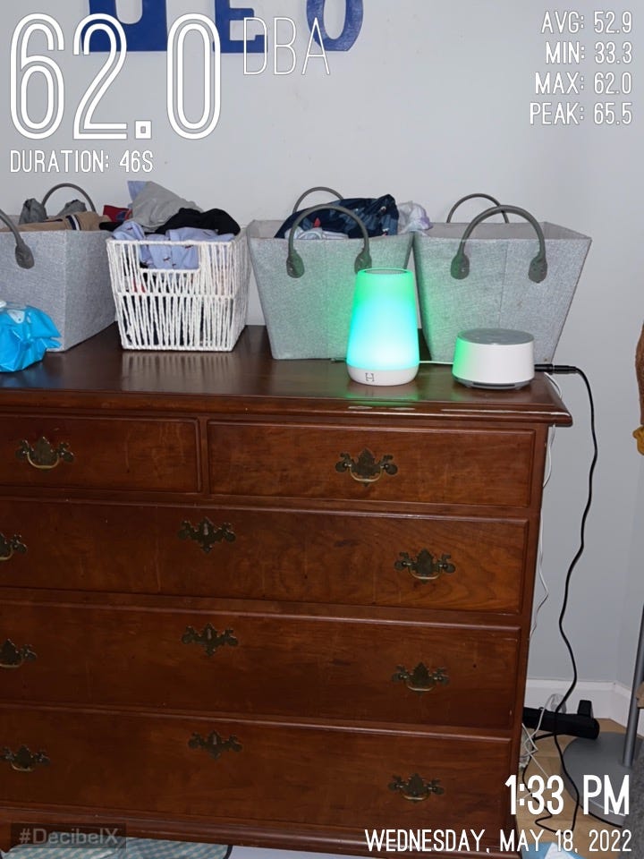 At full volume, the noise was annoying to my ears but maybe you have a little one who needs lots of white noise. Infant and toddler sound machines typically don’t go above 65 dB for hearing safety reasons, but even when my recorder was directly next to the Rest, the volume didn’t read higher than 62 dB (typically closer to 59 dB) so you could even turn this all the way up without any fear of hearing loss. 60 dB is about the noise level of a regular conversation.
