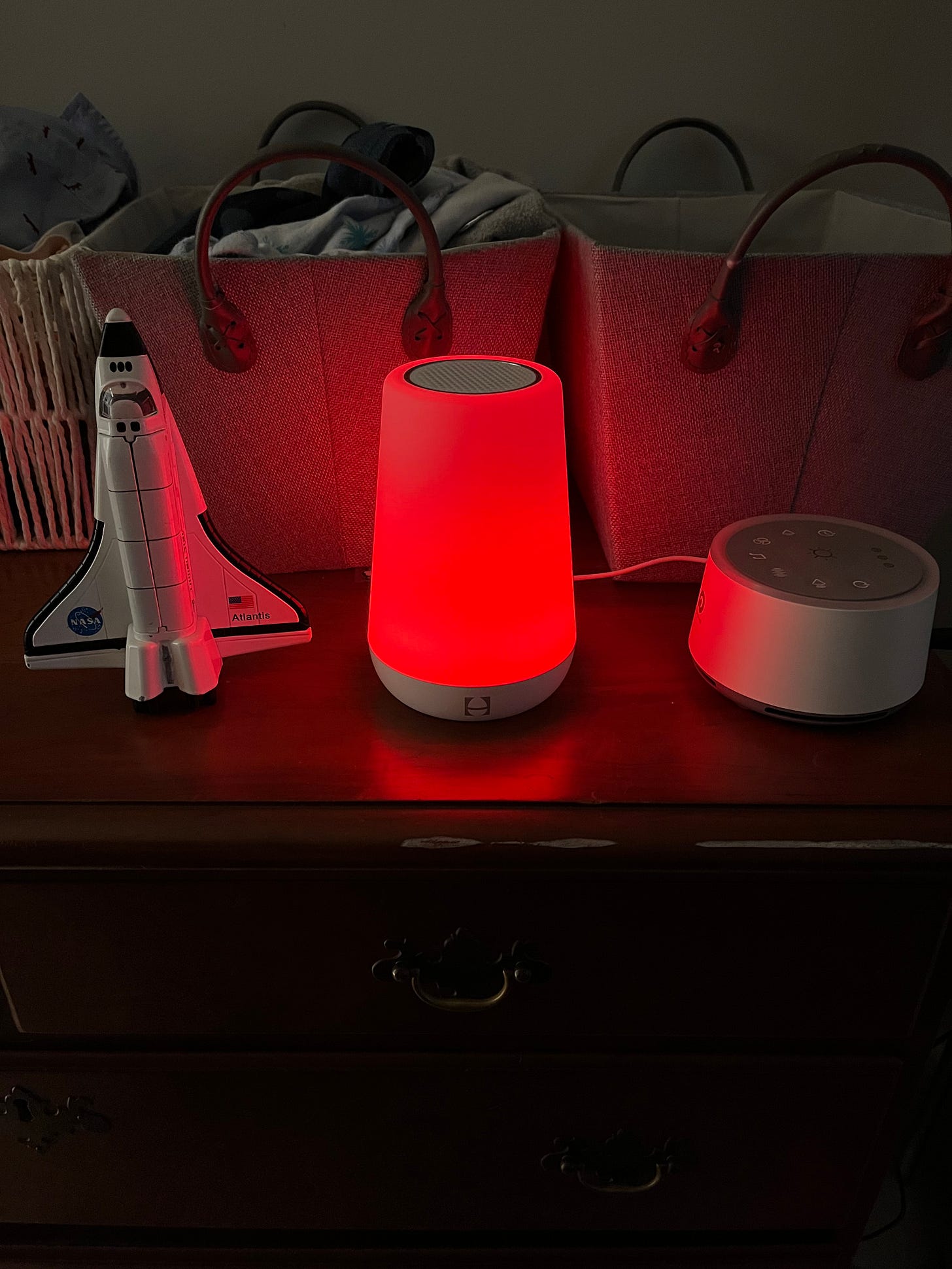 About a month before we moved our son into a toddler bed, my husband and I set up the Rest and talked up the new gadget. We told our son that it would glow red all night when it was bedtime and when the light turned green, that was when Mommy and Daddy would come to get him. He’s obsessed with cars and all vehicle-related analogies, so the idea that “green means go” worked well with him. Our son would usually wake up between 7 a.m. and 7:30 a.m., so we set the alarm to change colors at 7:30 a.m.